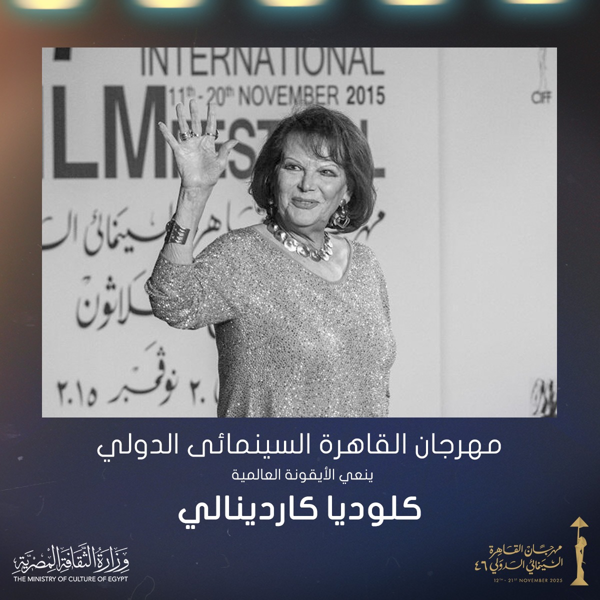 With deep sorrow, the Cairo International Film Festival bids farewell to the legendary Claudia Cardinale — a timeless icon whose career spanned over six decades, leaving an indelible mark on world cinema. She embodied beauty, freedom, and artistic brilliance, inspiring generations and captivating audiences across the globe.
