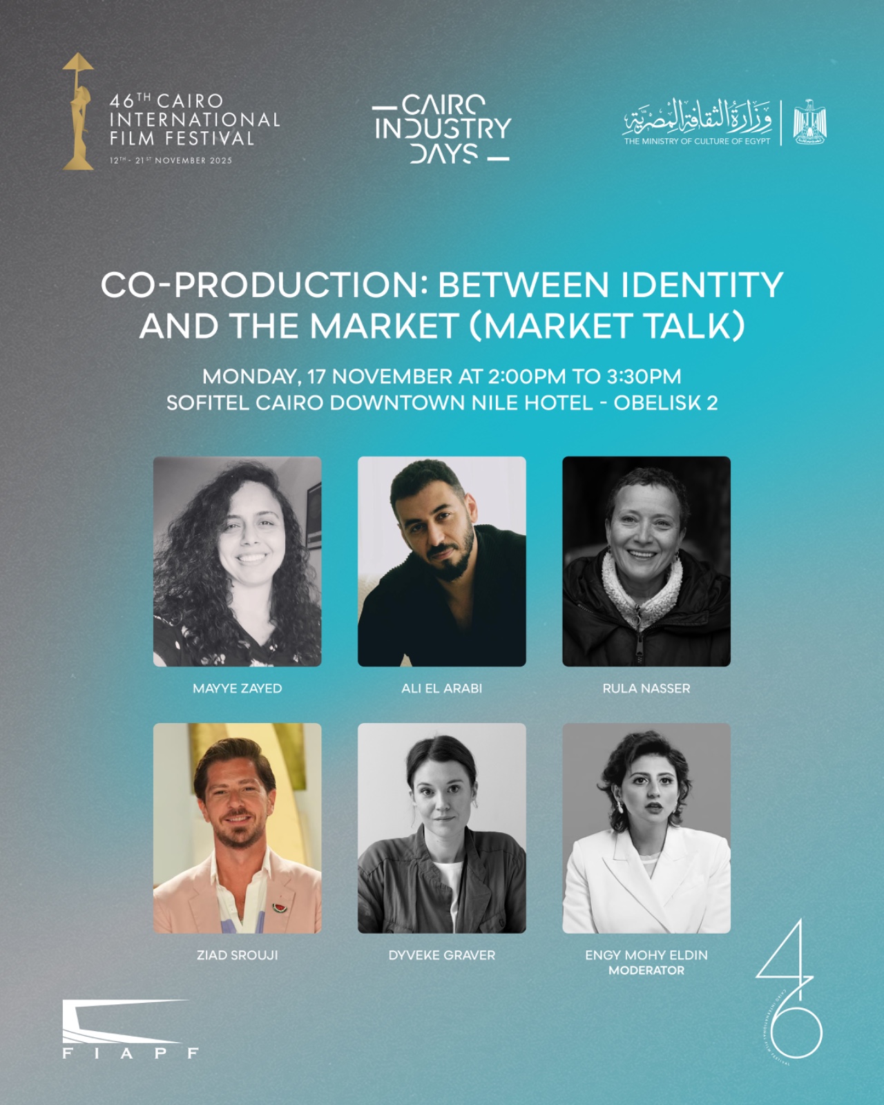 As part of Cairo Industry Days, held within the 46th Cairo International Film Festival, Obelisk Hall 2 at Sofitel Hotel hosts today, Sunday, November 16, a panel titled “Co-Production: Between Identity and Market Demands,” from 2:00 PM to 3:30 PM, with access reserved for badge holders. The session is moderated by screenwriter and filmmaker Engy Mohy El Din and features a distinguished panel of filmmakers: May Zayed, Ali El Arabi, Rula Nasser, and Devick Graver.