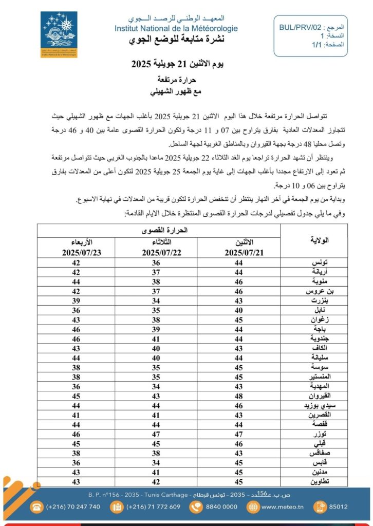 أفاد المعهد الوطني للرصد الجوي، اليوم الإثنين، أنه من المنتظر أن تشهد درجات الحرارة غدا تراجعا ماعدا الجنوب الغربي حيث تتواصل مرتفعة.