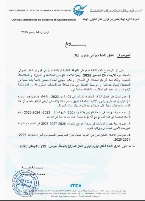 قررت الغرفة النقابية الوطنية لموزّعي قوارير الغاز المنزلي بالجملة تعليق نشاط القطاع في كافة أنحاء الجمهورية ليومي 12 و13 جانفي 2026.