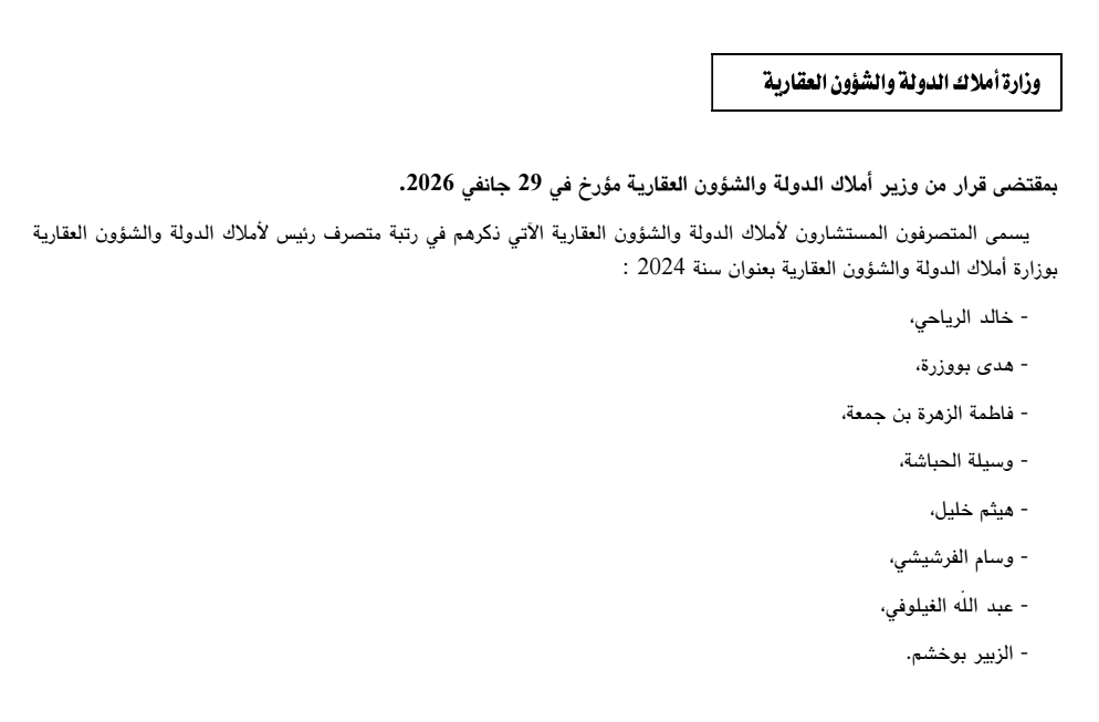 صدرت بالعدد الاخير للرائد الرسمي للجمهورية التونسية تسميات جديدة صلب وزارة أملاك الدولة والشؤون العقارية.